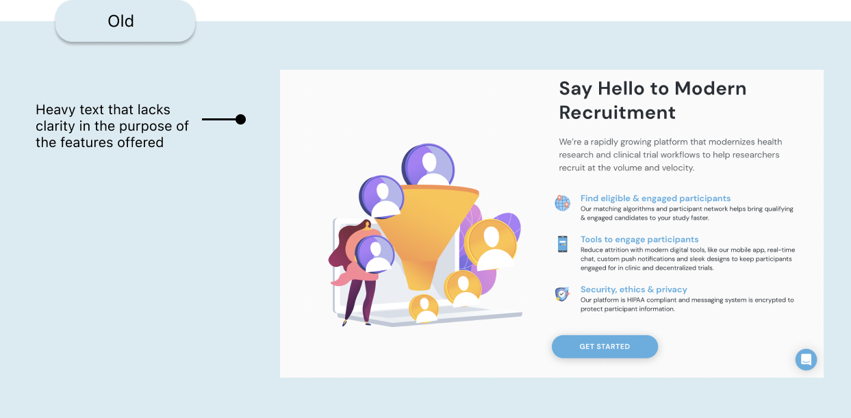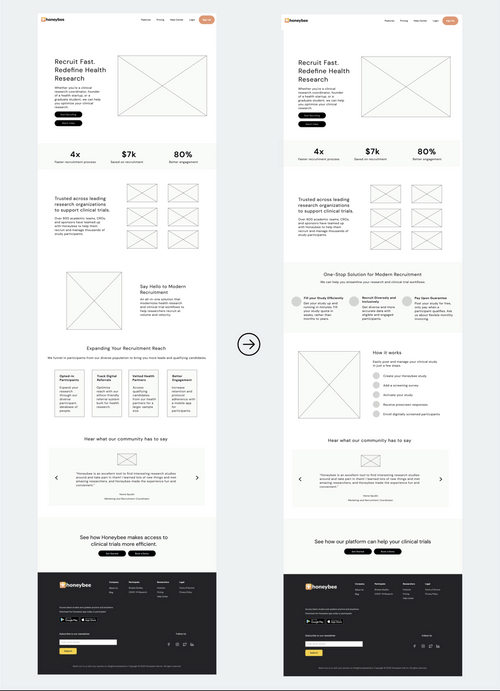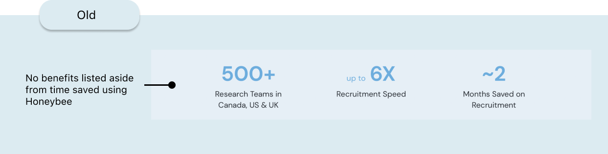Moving on to Webflow, I started designing the hero section first. Being the first thing people see when visiting the website, it was important to design the hero section that will immediately speak on what Honeybee offers along with the benefits. I followed a standard concept of a two-column layout with text and call-to-action on the left side, and image on the right. I began to think about how to write a copy that prioritized Honeybee's values and work to support sponsors with recruiting quality participants. In my redesign, I tried to highlight those values right away.