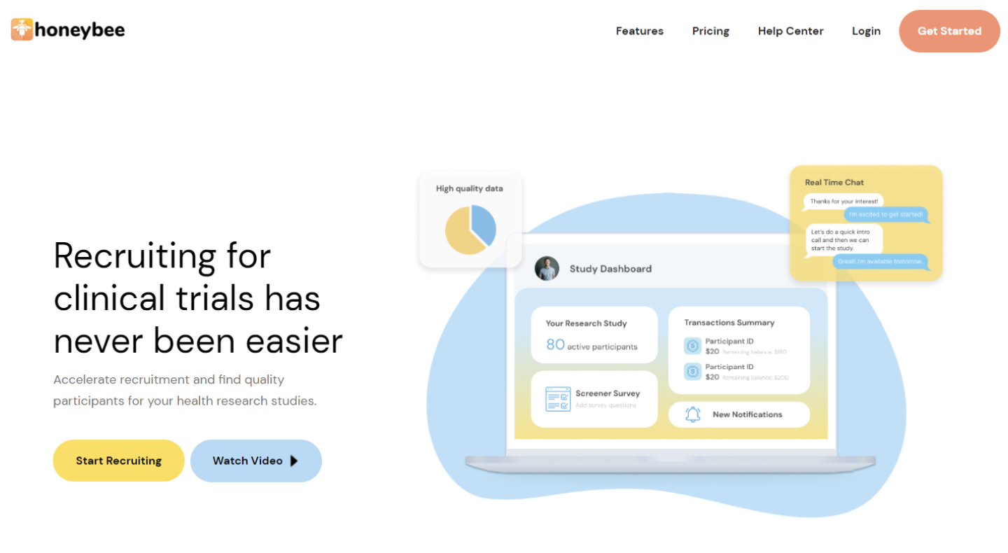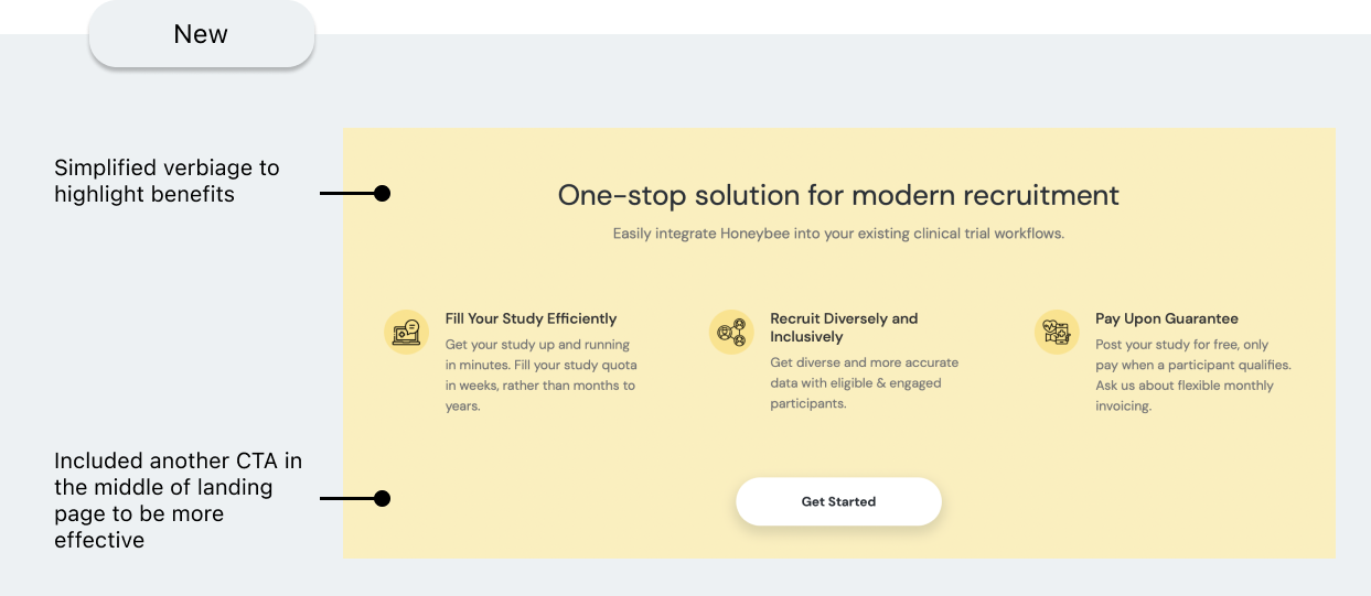 The CTA is one of the most crucial elements that needs to be addressed on the landing page as the CTA tells users what to do. Immediately, the user can identify what Honeybee is and what they offer, and are able to Start Recruiting. If the user requires more details, there is a Get Started CTA button placed in the navigation bar.