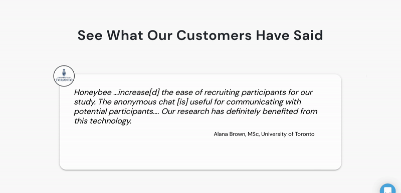 Throughout the landing page, I wanted the copy to be short and concise, so that the information is easily digestible for the users. I utilized the white space to keep the design minimal and to call attention to the blocks of information within each section. I moved the metrics section right below the hero section to show statistics on how Honeybee has helped existing users. The section following shows various academic and research organizations that have worked with Honeybee, increasing creditability of the product.